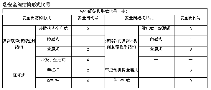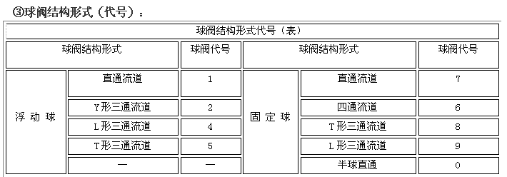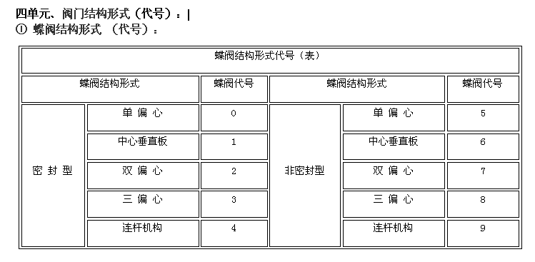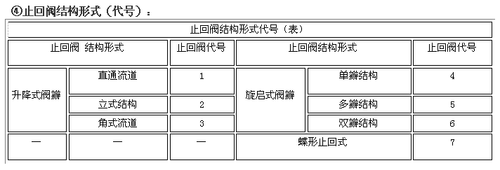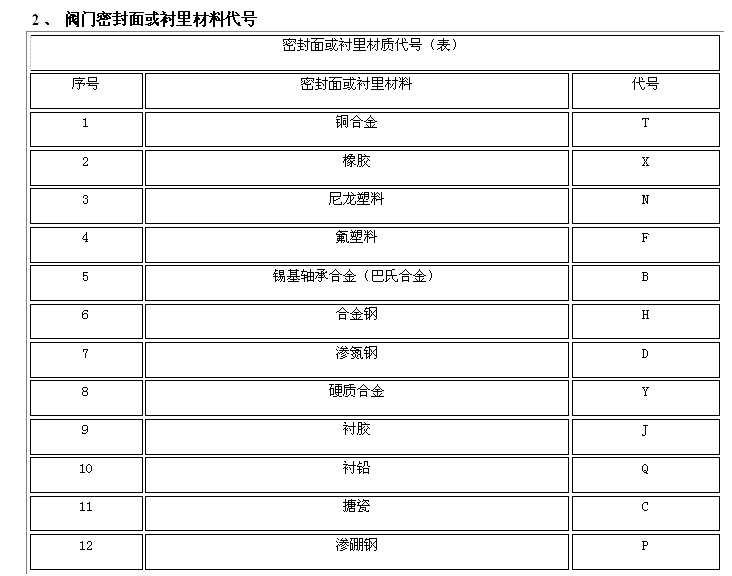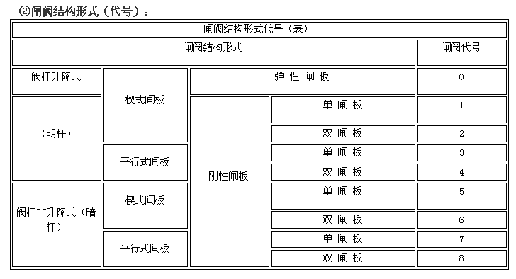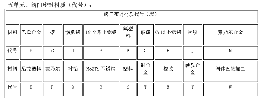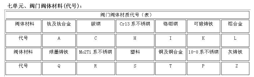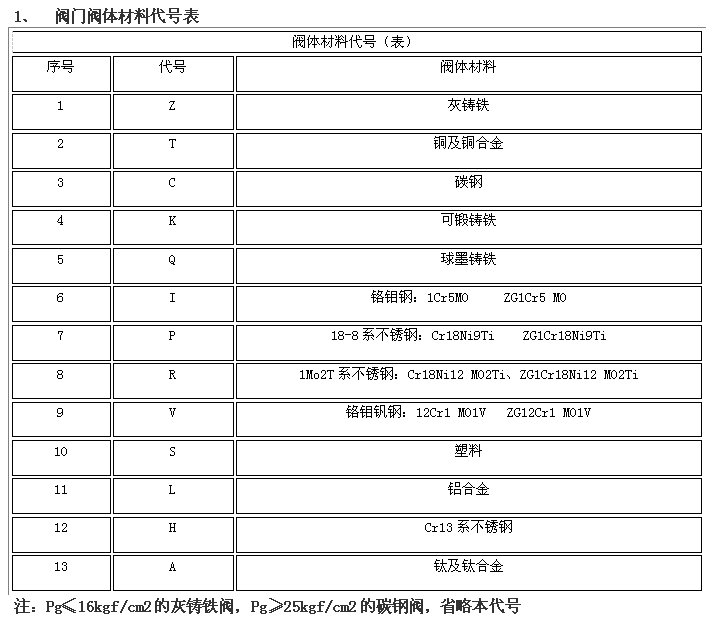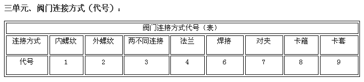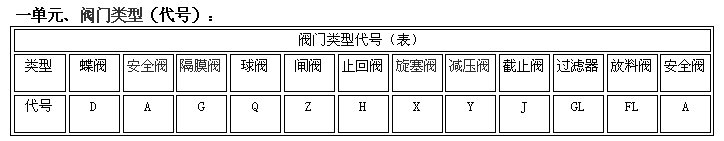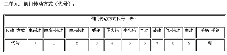 阀门型号编制方法,阀门型号表示方法,标准阀门型号编制说明阀门型号编制方法: 国家标准化管理委员会日前发布了《阀门型号编制方法》;由中国机械工业联合会提出,按照GB/T1.1-2009给出的规则起草,阀门型号编制方法由全国阀门标准化技术委员会(SAC/TC188)归口。 阀门型号编制方法规定了阀门的型号编制、阀门类型、驱动方式、连接形式、结构形式、密封面材料、压力和阀体材料代号和代号的表示方法。阀门型号编制方法适用于各类闸阀、截止阀、节流阀、蝶阀、球阀、隔膜阀、旋塞阀、止回阀、排污阀、柱塞阀、减压阀、疏水阀、安全阀的管道阀门产品。 阀门型号表示方法: 当今阀门的类型和材料种类越来越多,阀门型号的编制也愈来愈复杂; 阀门型号通常应表示阀门类型、驱动方式、连接形式、结构特点、公称压力、密封面材料、阀体材料等要素。阀门型号的标准化对阀门的设计、选用、经销,提供了方便。我国虽然有阀门型号编制的统一标准,但逐渐不能适应阀门工业发展的需要;目前,阀门制造厂一般采用统一的编号方法;不能采用统一编号方法的,各生产厂家可按自己的情况制订出编号方法。 六单元、阀门公称压力数值用阿拉伯数字直接表示(MPa)它是MPa的10倍。 注:1、由阀体直接加工的阀座密封材料代号用“W”表示。 2、当阀座和阀瓣(阀板)密封材料不同时,用低硬度材料代号表示(隔膜阀除外)。 阀门型号和名称编制方法示例 : a) 闸阀型号编制示例:电动、法兰连接、明杆楔式双闸板,阀座密封面材料由阀体直接加工,公称压力PN0.1MPa、阀体材料为灰铸铁的闸阀:Z942W-1电动楔式双闸板闸阀。 b) 球阀型号编制示例:手动、外螺纹连接、浮动直通式阀座密封面材料为氟塑料、公称压力 PN4.0MPa、阀体材料为1Crl8Ni9Ti的球阀:Q21F-40P外螺纹球阀。 c)隔膜阀型号编制示例: 气动常开式、法兰连接、屋脊式结构并衬胶、公称压力 PN0.6MPa、阀体材料为灰铸铁的隔膜阀:G6K41J-6 气动常开式衬胶隔膜阀。 d) 蝶阀型号编制示例:液动、法兰连接、垂直板式、阀座密封材料为铸铜、阀瓣密封面材料为橡胶、公称压力PN0.25MPa、阀体材料为灰铸铁的蝶阀:D741X-2.5液动蝶阀。 e)截止阀型号编制示例: 电动驱动对接焊连接、直通式、阀座密封面材料为堆焊硬质合金、工作温度540℃时工作压力7.0MPa、阀体材料铬钼钒钢的截止阀:J961Y-P54170V电动焊接截止阀